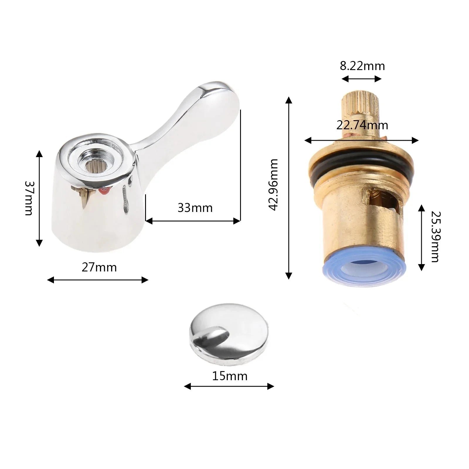 Matériau : Laiton, Céramique Nombre de dents sur la clavette : 20 dents Taille des vannes de remplacement : 43 mm / 1,69 in 53 mm / 2,08 in Taille de la poignée : Environ 60 x 37 mm / 2,36 x 1,45 in