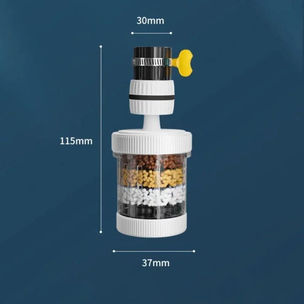 Matériau : PP + PS + PVC Couleur : Bleu Dimensions : 115 x 37 mm Pièce : Cuisine Type : Tête de robinet rotative filtre eau Type de raccord entrée/sortie : Diamètre de robinet 1,5 à 3,2 cm Flexible d’alimentation : Non Eau chaude / eau froide : Dépend du robinet d’origine Contrôle de la température : Dépend du robinet d’origine