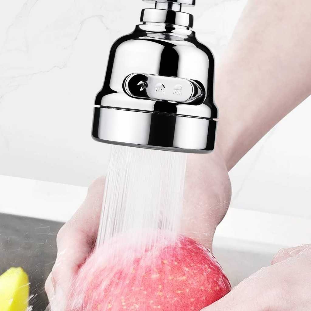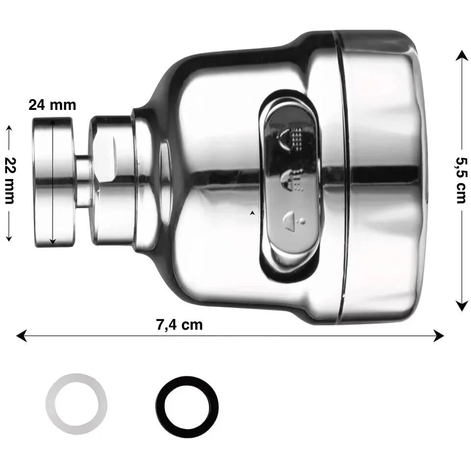 Matériau : ABS, Silicone et Acier inoxydable Dimensions : 5,5 x 7,4 cm Poids : 250g Pièce : Cuisine Type : Buse rotative pour robinet rotation 360° Type de raccord entrée/sortie : 24 mm de filetage intérieur ou 22 mm de filetage extérieur, filetage mâle Flexible d’alimentation : Non