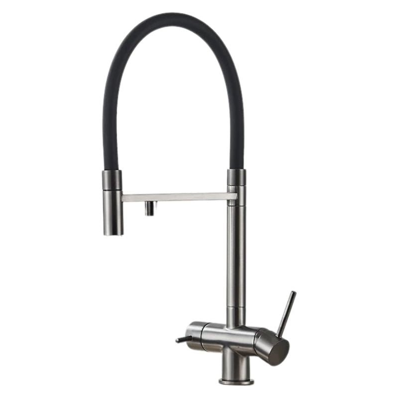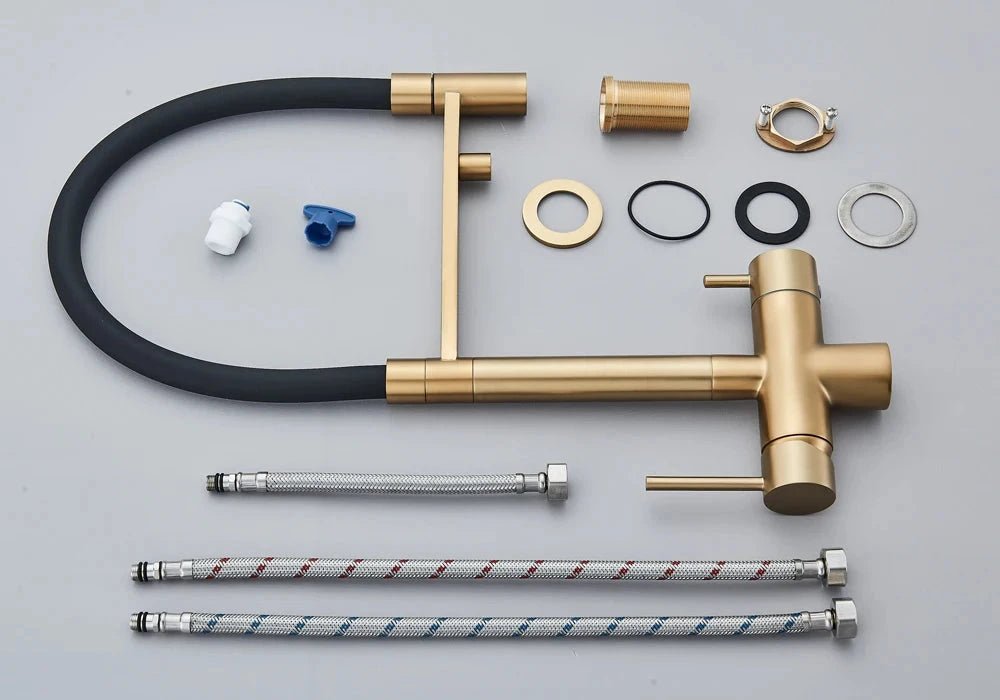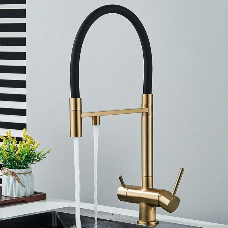 Ce robinet 3 voies se distingue par son corps en laiton doré brossé et son tuyau noir souple qui offre un contraste moderne. Son style minimaliste en fait une pièce maîtresse dans toute cuisine design. Grâce à ses trois voies intégrées, il permet une gestion intelligente de l’eau potable et domestique sans installation supplémentaire. Idéal pour les cuisines qui allient esthétique et technologie.