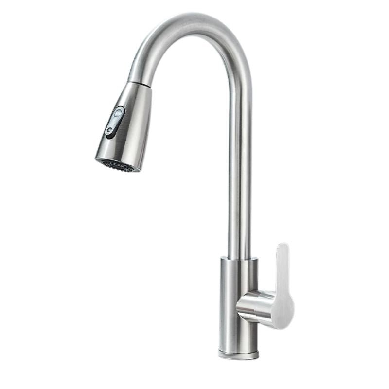 Ce robinet col de cygne mitigeur en inox brossé allie élégance contemporaine et performance au quotidien. Doté d’un bec haut arrondi et d’une douchette extractible avec double jet, il permet de basculer facilement entre un jet concentré et un jet pluie pour s’adapter à toutes les tâches de la cuisine. Son levier ergonomique latéral assure un réglage fluide de la température et du débit. Grâce à sa finition anti-traces, ce mitigeur conserve son éclat même après une utilisation intensive. Une solution tout-en-un pour moderniser votre évier avec style.