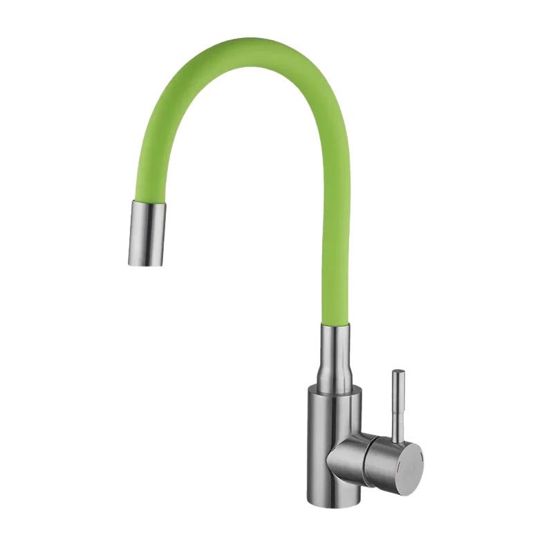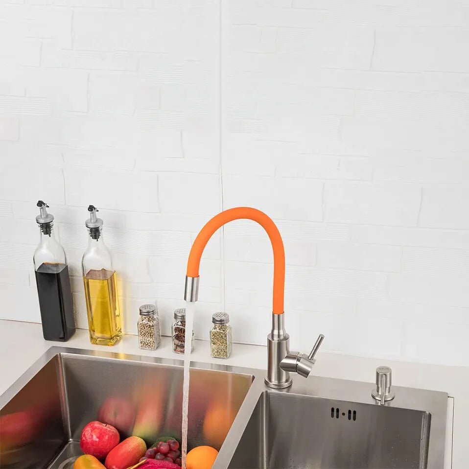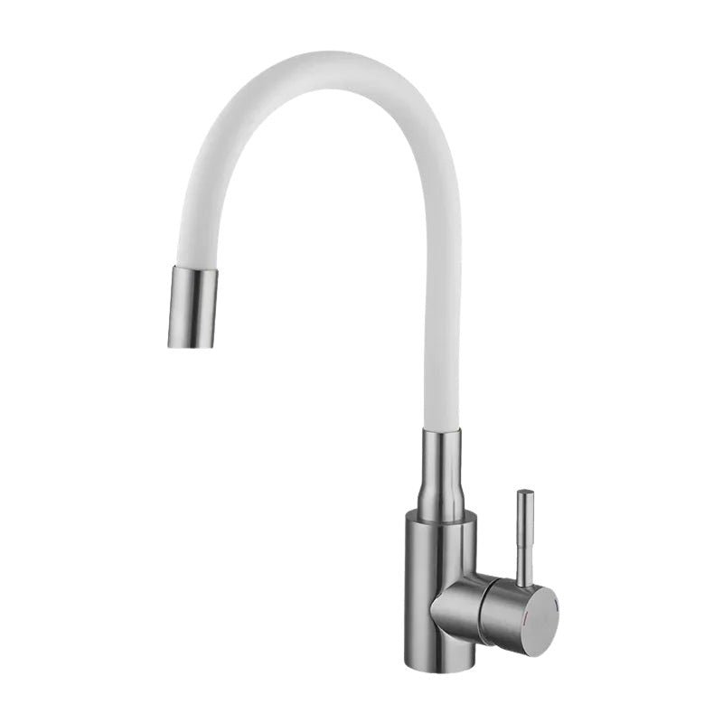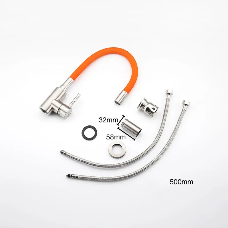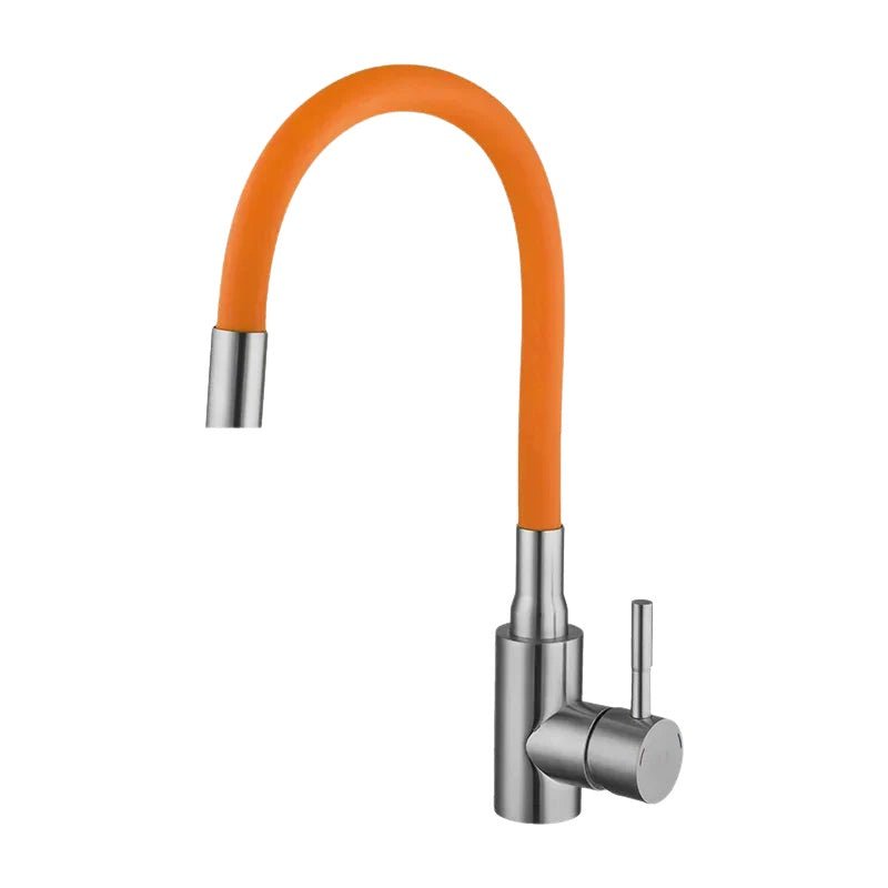 Matériau : Acier inoxydable 304 Couleur robinet : Argenté brossé Couleur flexible : orange, blanc, vert, noir, gris Dimensions : Flexible 490 mm, Base 42 mm Pièce : Cuisine Type : Robinet évier flexible coloré mitigeur Type de raccord entrée / sortie : Entrée 1/2 femelle Flexible d’alimentation : Oui (2 flexibles de 50 cm inclus) Eau chaude / eau froide : Oui Contrôle de la température : Manuel