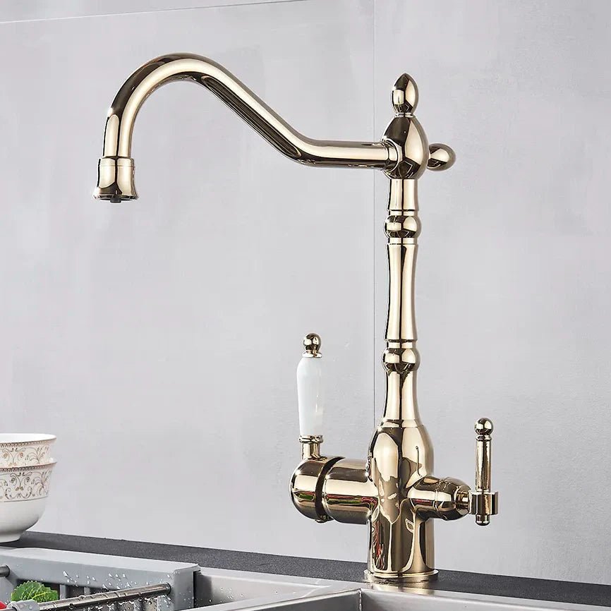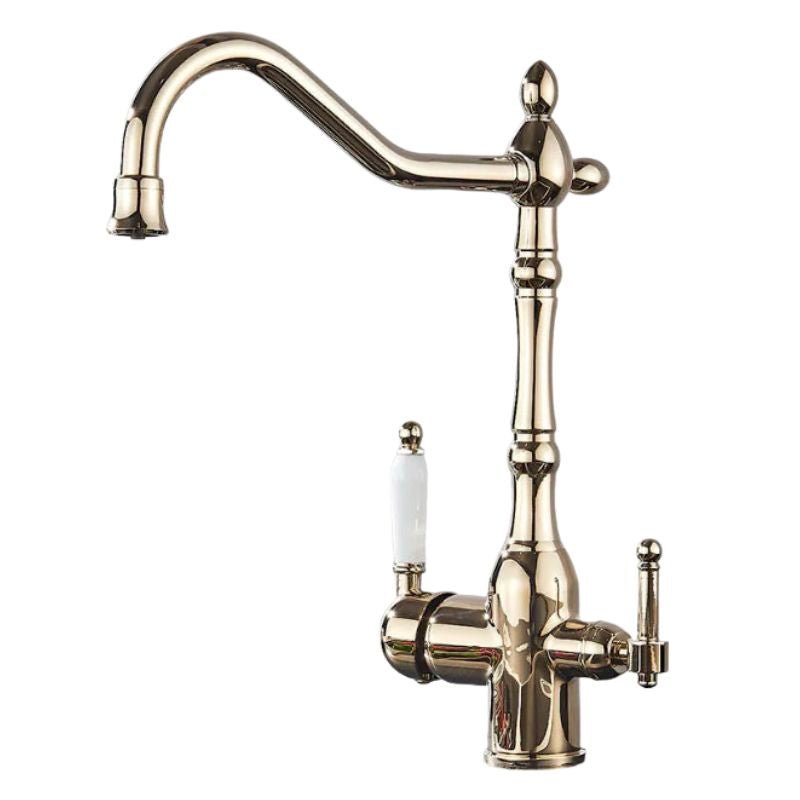Matériau : Laiton Couleur : Doré brillant, Doré bronze brossé Dimensions : 340 x 285 mm Pièce : Cuisine Type : Robinet évier rétro avec mitigeur purificateur Type de raccord entrée / sortie : Femelle 1/2 Flexible d’alimentation : Oui (2 flexibles eau froide – 1 flexible eau chaude) Eau chaude / eau froide : Oui / Oui Contrôle de la température : Manuel