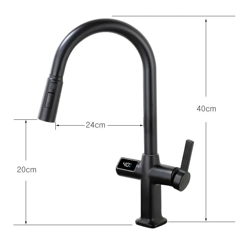 Matériau : Laiton Couleur : Noir mat Douchette avec 3 modes de jet : classique, multijet, double jet Affichage numérique thermostatique Longueur flexible : 60 cm maximum Dimensions : 40 x 24 cm Pièce : Cuisine Type : Mitigeur thermostatique avec douchette Type de raccord entrée / sortie : 1/2 femelle Flexible d’alimentation : Oui Eau chaude / eau froide : Oui Contrôle de la température : Thermostatique avec affichage numérique