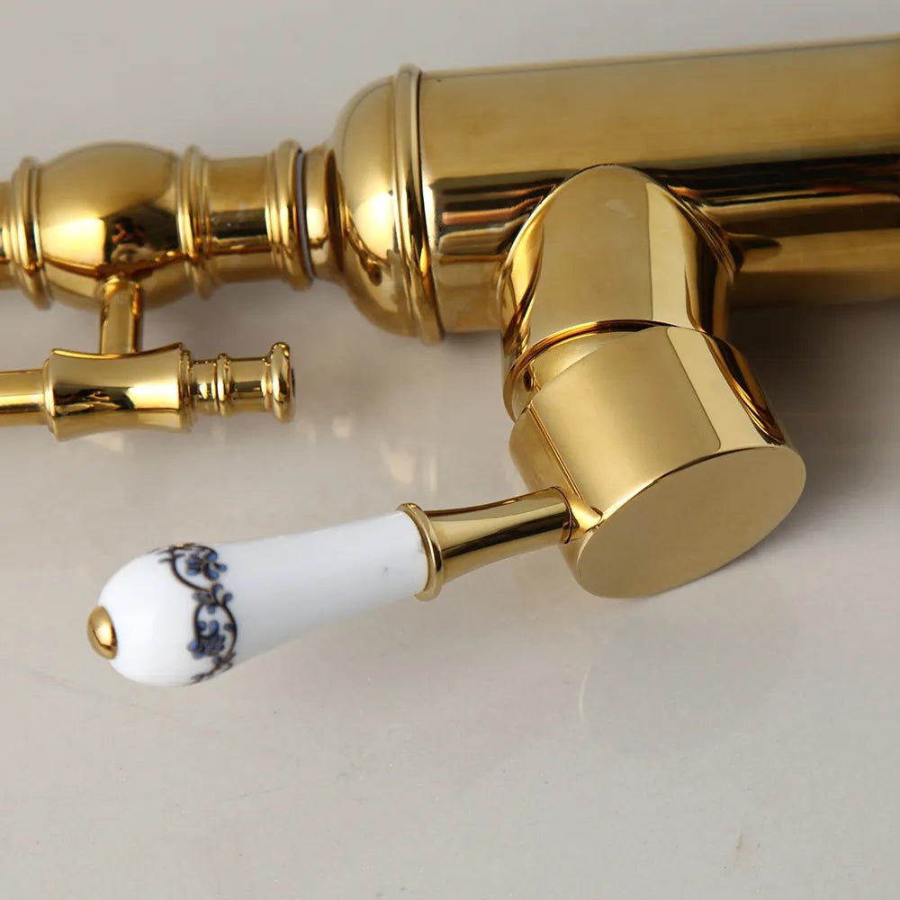 Ce robinet de cuisine se distingue par sa finition dorée et ses détails en céramique, offrant un style vintage haut de gamme. Son esthétique élégante est idéale pour les cuisines au design classique ou rétro, ajoutant une touche de sophistication.