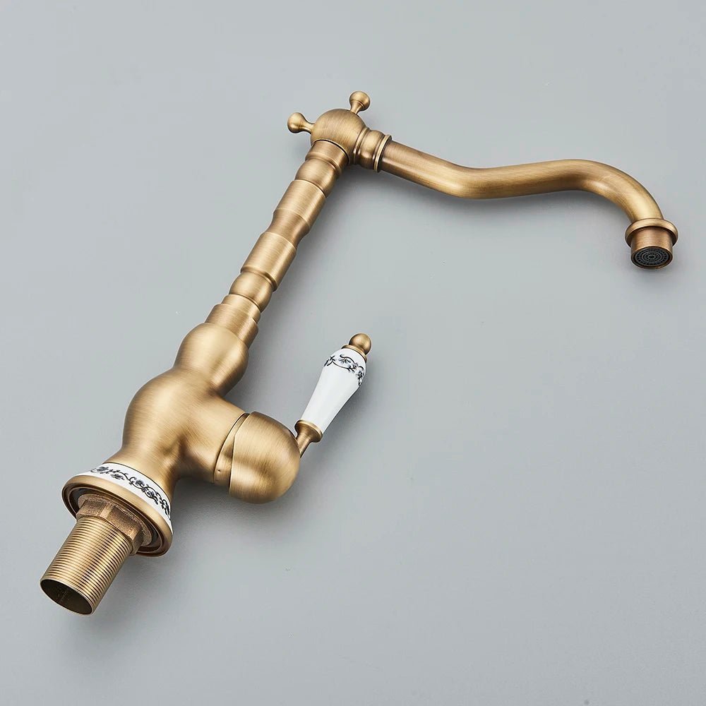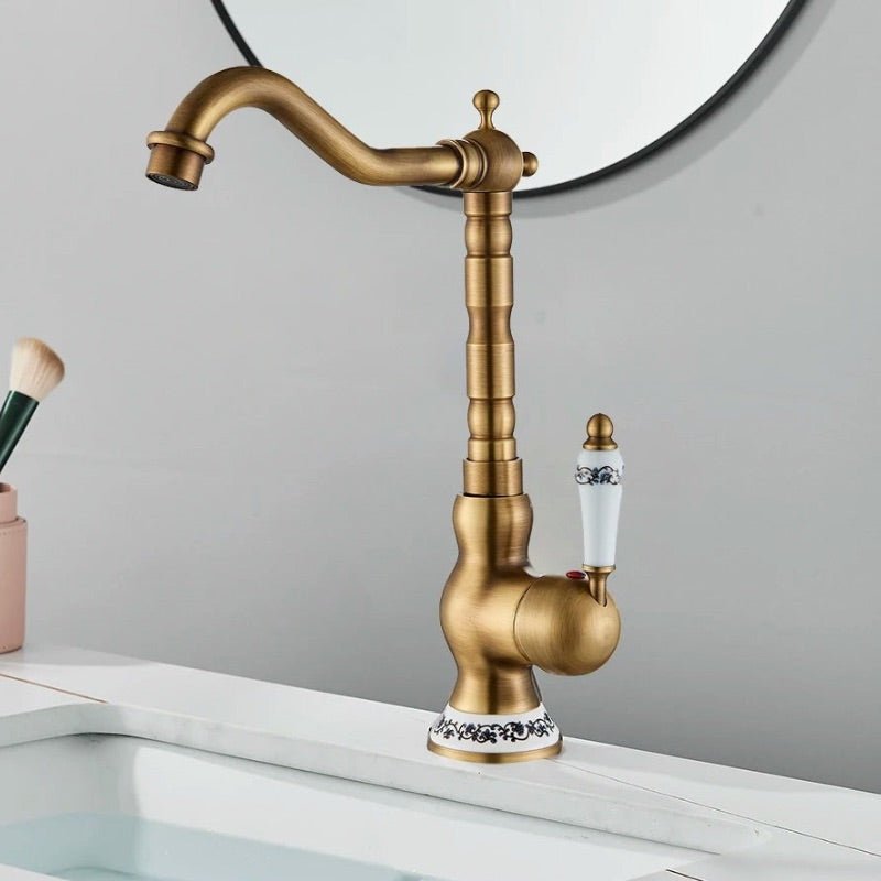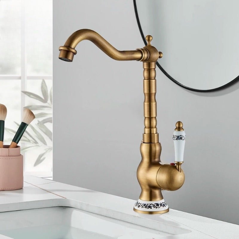 Matériau principal : Cuivre (laiton épaissi, résistant à la corrosion et durable) Cartouche : Noyau de valve en céramique (résistant à l’usure, durable, empêche les fuites d’eau) Utilisation : Rotation à 360° pour plus de flexibilité Bec haut offrant plus d’espace pour les activités Ajustement de l’eau chaude et froide pour différents besoins quotidiens Design : Finition bronze brossé antique Poignée et base ornées de motifs en céramique Style élégant et vintage