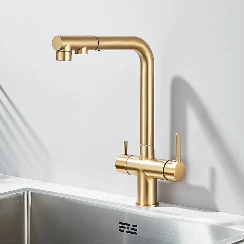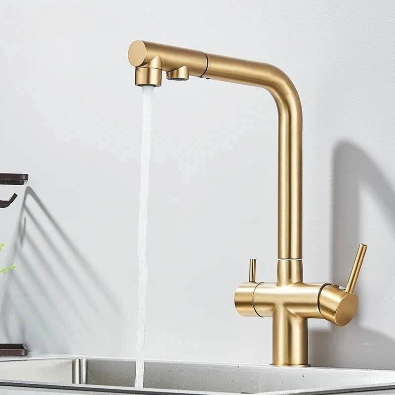 Ce robinet design de cuisine incarne l’élégance et la fonctionnalité dans un format tout-en-un. Sa finition dorée mate sublime instantanément l’espace, tandis que sa double sortie permet d’accéder à la fois à l’eau classique (chaude/froide) et à l’eau filtrée, via un circuit indépendant. Grâce à ses deux leviers ergonomiques, le contrôle est intuitif et précis. Conçu pour les cuisines modernes et haut de gamme, ce mitigeur combine esthétique, hygiène et praticité au quotidien. Il s’installe facilement sur un évier standard et s’adapte aux systèmes de filtration.
