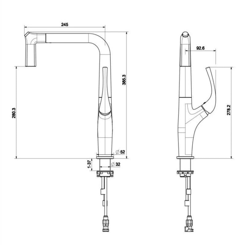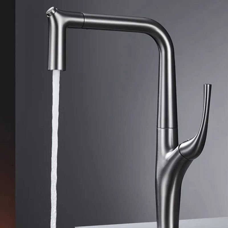 Eau chaude et froide : Oui Contrôle : Valve Installation : Sur plan (deck mounted) Montage : Vertical Matériau : Laiton Nombre de poignées : Une seule poignée Nombre de trous pour l’installation : Un seul trou Bec rotatif : Oui Type de bec : Pivotant Type de jet : Pull-out Style : Support simple, trou unique, contemporain Finitions disponibles : Chrome / Noir / Nickel Traitement de surface : Poli Type : Cartouche à disque en céramique Matériau du noyau de valve : Céramique