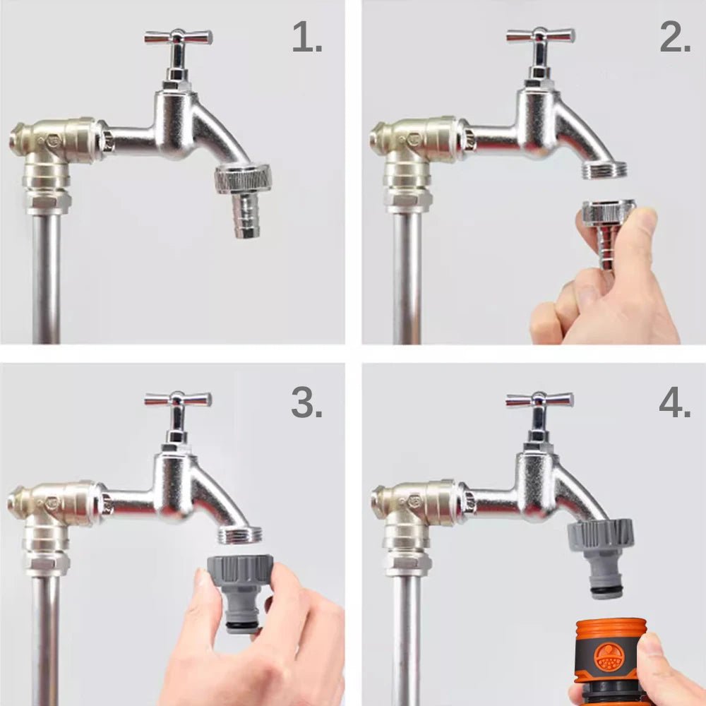 Ce robinet 1/2 est parfaitement adapté pour accueillir des adaptateurs de type raccord rapide. En quelques secondes, vous pouvez connecter un tuyau d’arrosage ou tout autre équipement sans outils. La photo montre clairement un système en 4 étapes pour une installation simple et rapide. Cette compatibilité vous permet de passer d’un usage à un autre sans perte de temps ni fuite.