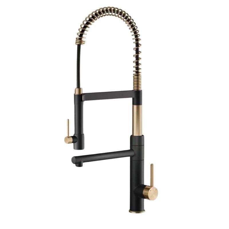 Ce robinet de cuisine avec douchette extractible est l’alliance parfaite entre performance professionnelle et design raffiné. Sa finition dorée mate apporte une touche d’élégance à votre cuisine, tandis que sa douchette extensible à ressort et son bras articulé offrent une liberté de mouvement exceptionnelle. Idéal pour rincer fruits, légumes ou vaisselle, ce robinet est conçu pour un usage intensif au quotidien. Son levier latéral assure un contrôle fluide de la température et du débit. Un choix premium pour ceux qui veulent conjuguer esthétique, praticité et durabilité.