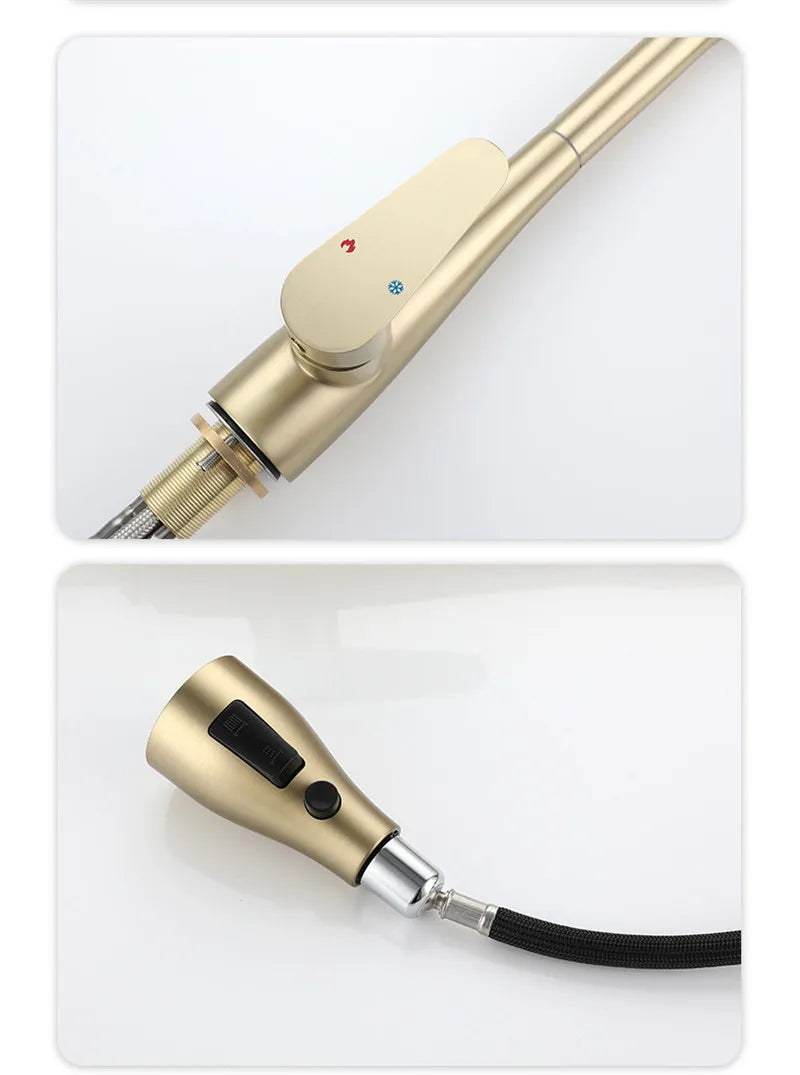 Ce robinet douchette pour lavabo allie esthétisme raffiné et fonctionnalité avancée. Avec son corps en laiton finition dorée mate et sa douchette extractible à double jet, il offre un confort d’utilisation optimal. Idéal pour un lavabo ou un évier compact, son bec col de cygne haut permet un large espace de travail. Le levier latéral facilite le réglage de la température et du débit. Sa douchette rétractable revient automatiquement en place, simplifiant les gestes du quotidien. Parfait pour une salle de bain ou une cuisine moderne où design et efficacité vont de pair.