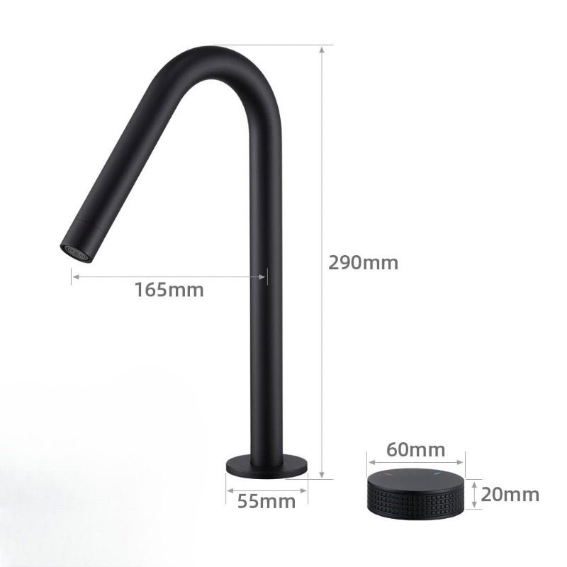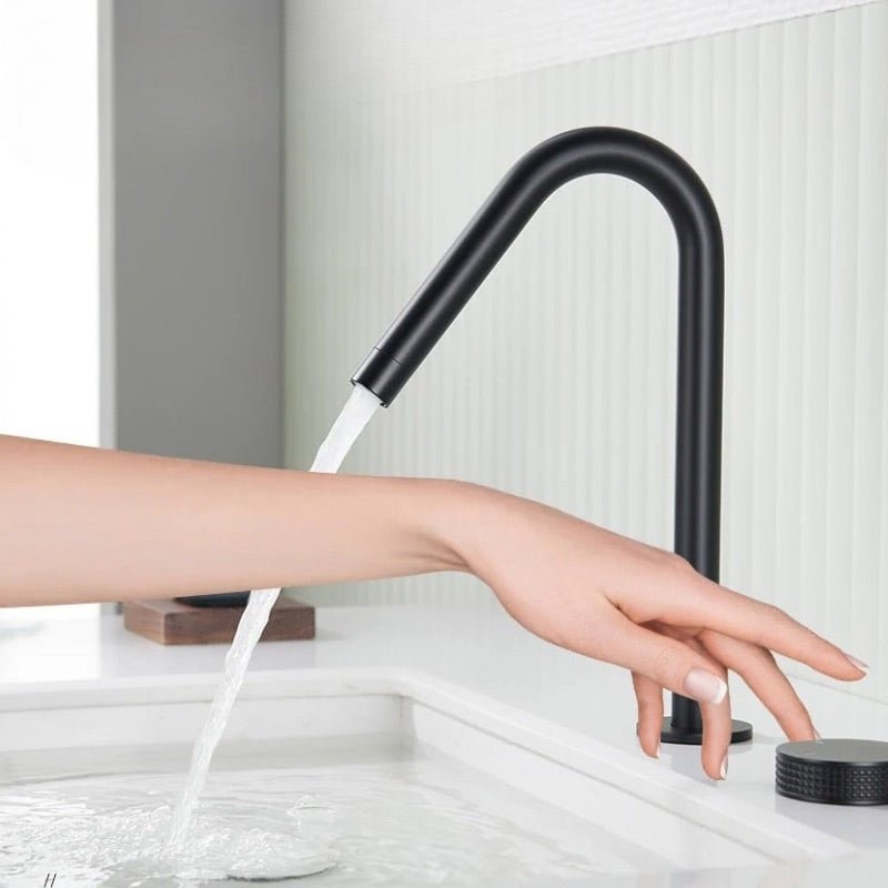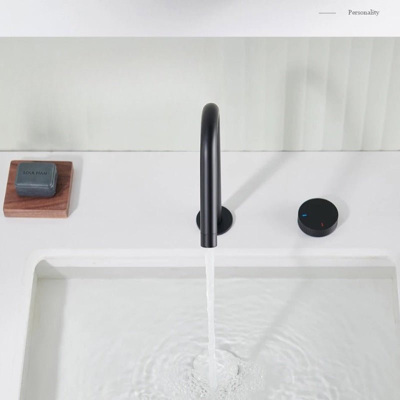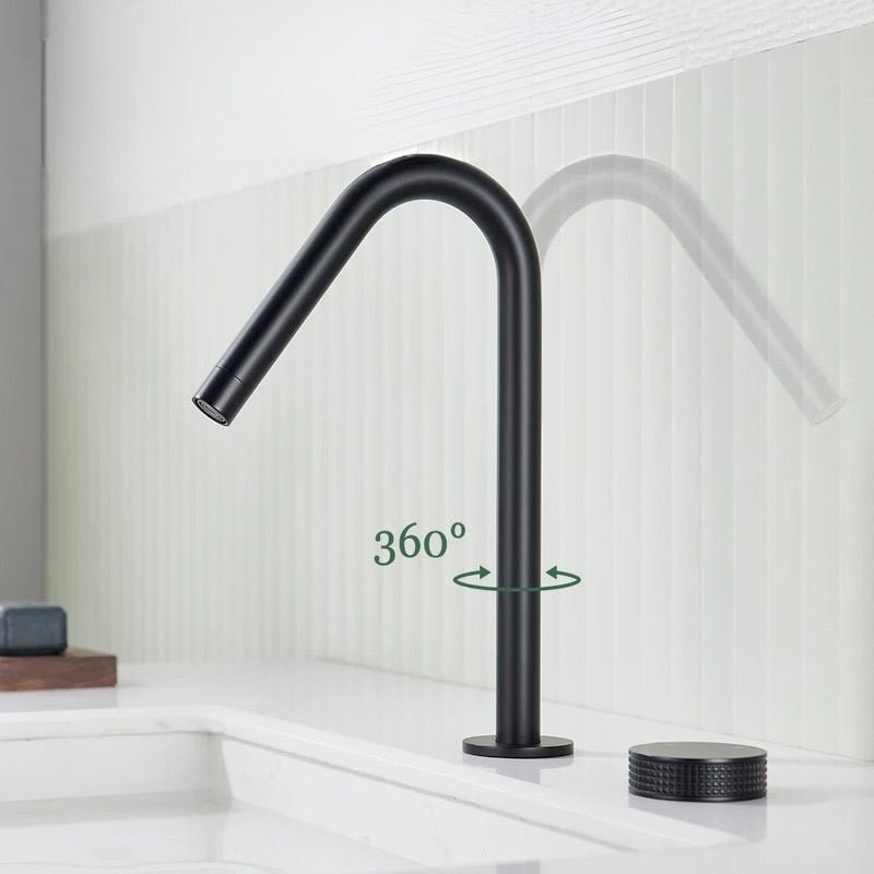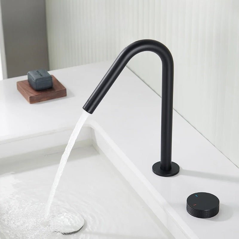 class="">Ce robinet lavabo mélangeur noir mat incarne la pureté du design contemporain. Doté d’un bec haut en arc élégant et d’une molette rotative séparée pour régler la température et le débit, il offre un confort d’utilisation tout en mettant en valeur votre espace lavabo. Sa finition mate apporte une touche raffinée, résistante aux traces de doigts et à la corrosion. Idéal pour les salles de bain modernes à l’esthétique minimaliste, ce robinet est aussi fonctionnel que stylé. Un choix parfait pour sublimer votre quotidien.